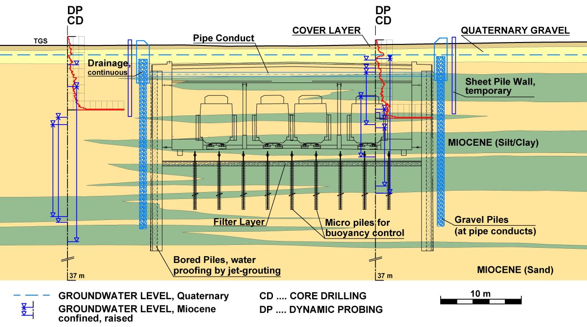 With consideration of numerous subsoil investigation campaigns already carried out within the project area, additional 104 core drillings, 36 pumping tests, 106 dynamic probings and 66 exploratory pits were planned, supervised and evaluated for the actual project. Furthermore, the hydrogeologic situation and especially existing wells were extensively explored. Based on the acquired data, the expert's report for geology, geotechnics and hydrogeology was elaborated.