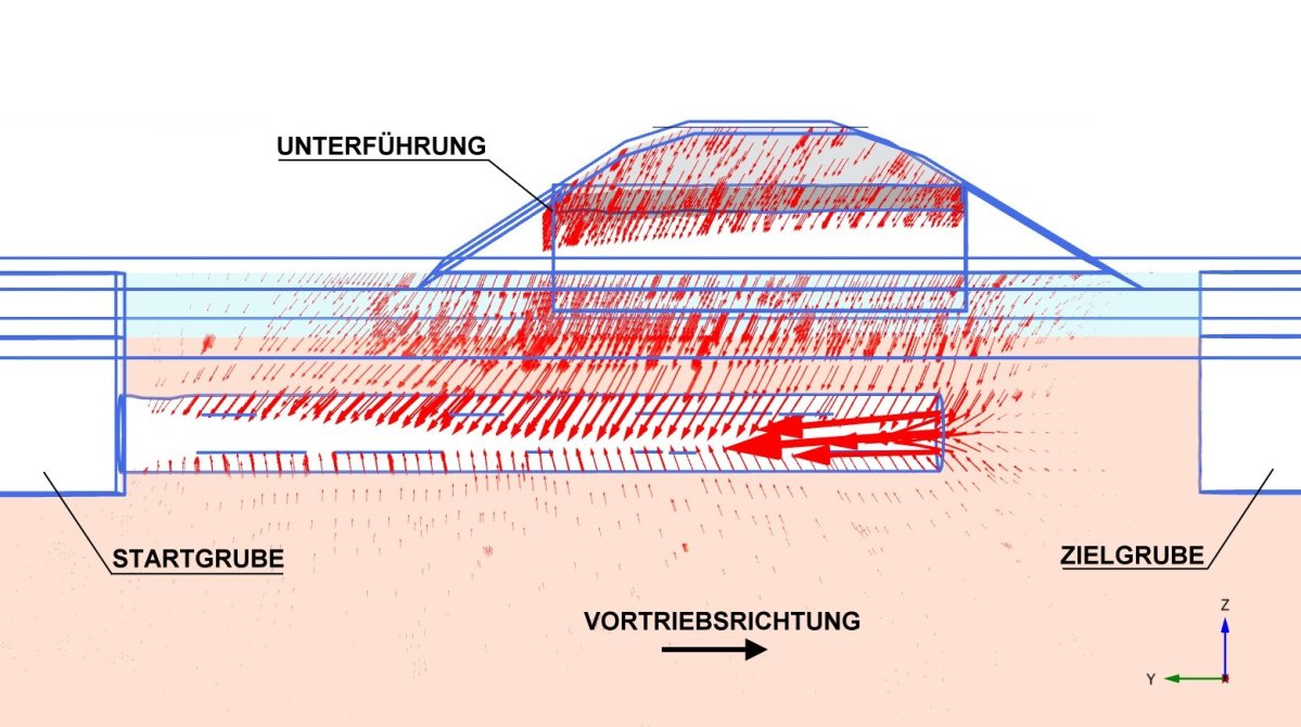 Da die gegenständliche Rohrquerung im Bereich des Querungsobjektes unterhalb dessen Fundierungsniveau verläuft, waren sowohl die Deformationen des Objektes als auch jene des Gleises relevant. Aufgrund des relativ großen Querschnittes des Vortriebs (Ø 3,6 m) war es wesentlich, auch die Auswirkungen der progressiv fortschreitenden Entspannungsvorgänge an der Ortsbrust zu berücksichtigen. Der Vortrieb wurde daher in 40 einzelnen Phasen modelliert.